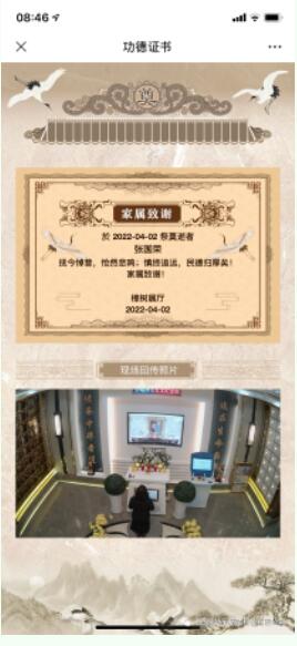 4、現(xiàn)場祭奠儀式自動完成后,家屬親友會收到現(xiàn)場祭奠照片及功德證書推送,點開即可查閱詳細內(nèi)容。