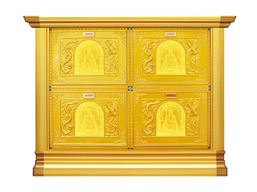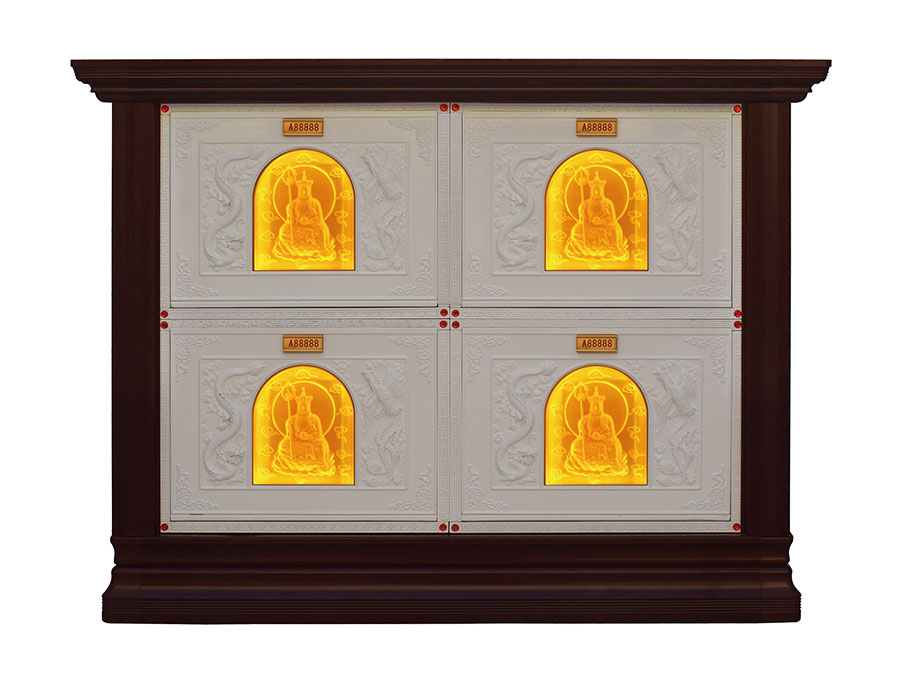 骨灰存放架是由箱體、面板、側(cè)板、頂蓋、底座、轉(zhuǎn)角、封板等構(gòu)成,以及佛臺、掛落、佛 龕等相關(guān)配件構(gòu)成。 箱體:分鍍鋅板、不銹鋼板、鋁板等五金板材箱體,鋁合金中空板扣接式箱體和純鋁壓鑄型 箱體。 面板:面板根據(jù)工藝不同、材料不同,風(fēng)格各異、大不相同,既要起到美觀易分類作用,又 要起到防火、防塵、防潮、防蟲等作用。 側(cè)板:用于裝飾和保護(hù)箱體側(cè)面的作用,又可根據(jù)現(xiàn)場,對存放架分類的標(biāo)識作用,一目了 然方便管理。 頂蓋、底座:都是穩(wěn)固整列和整排箱體水平線,底座還起到一部分承重作用。 轉(zhuǎn)角、封板:箱體轉(zhuǎn)彎處和空隙處塑形的作用。 佛臺:由幾個骨灰存放架組成一個小型佛龕臺,用于放置佛像。 佛龕、掛落:整排存放架為了劃分區(qū)域,在每個區(qū)域靠墻上方,設(shè)置小型佛龕,為了美觀, 加上掛落。