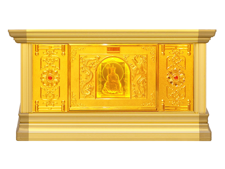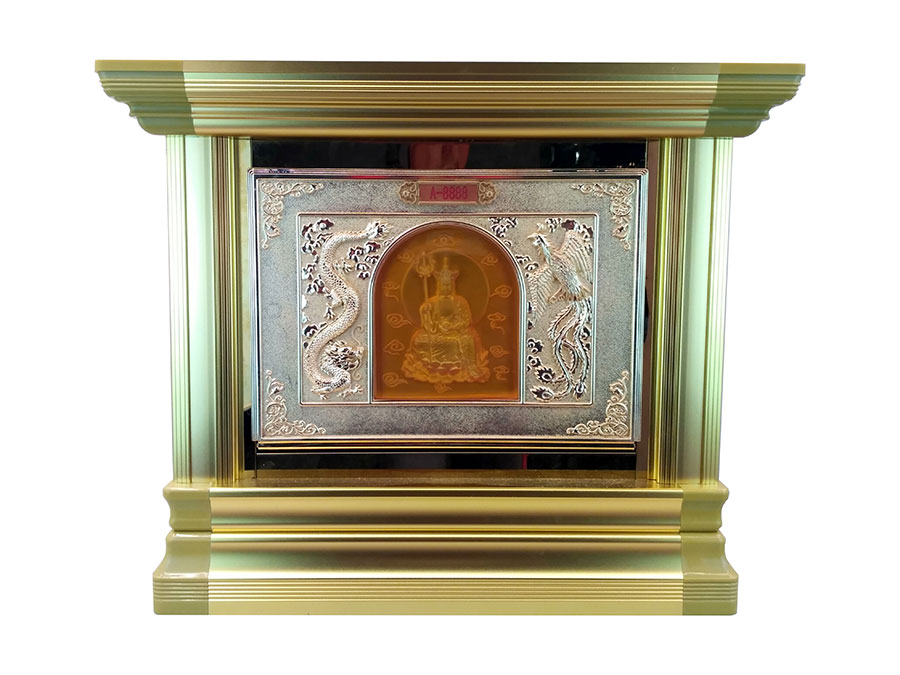 整體用材均采用純鋁合金壓鑄一次成型,箱體內(nèi)均附有龍鳳呈祥圖案,表面采用 琉璃面板加?LED?七彩燈光,頂蓋、底座為優(yōu)質(zhì)鋁合金。